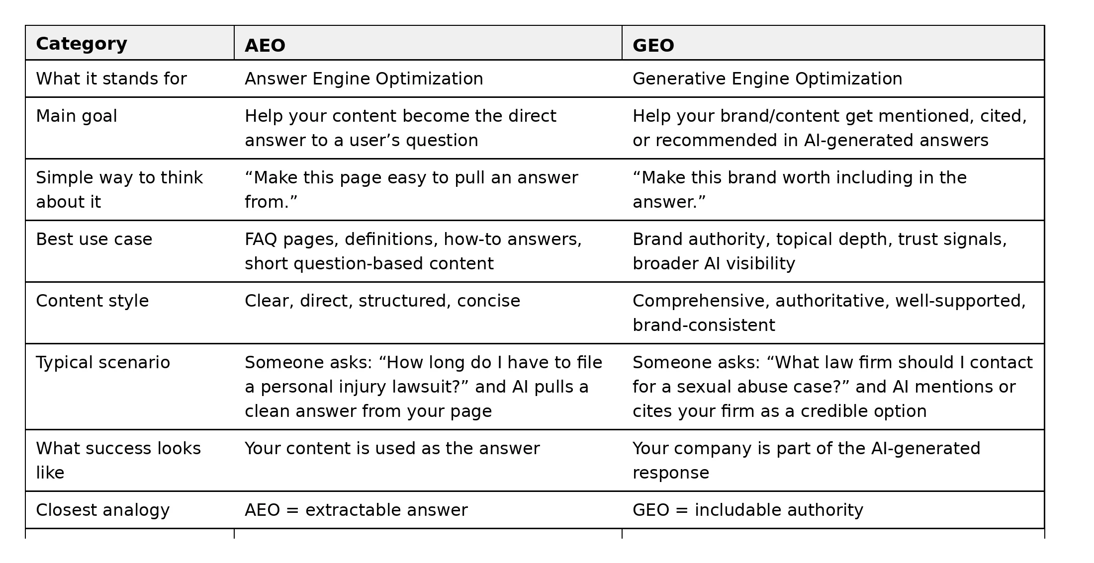 With AEO, you are creating content that answers common questions clearly, directly, and in a structured way. Think FAQ pages, glossary pages, statute-of-limitations explainers, “what happens next?” pages, and short sections that answer one question cleanly near the top.