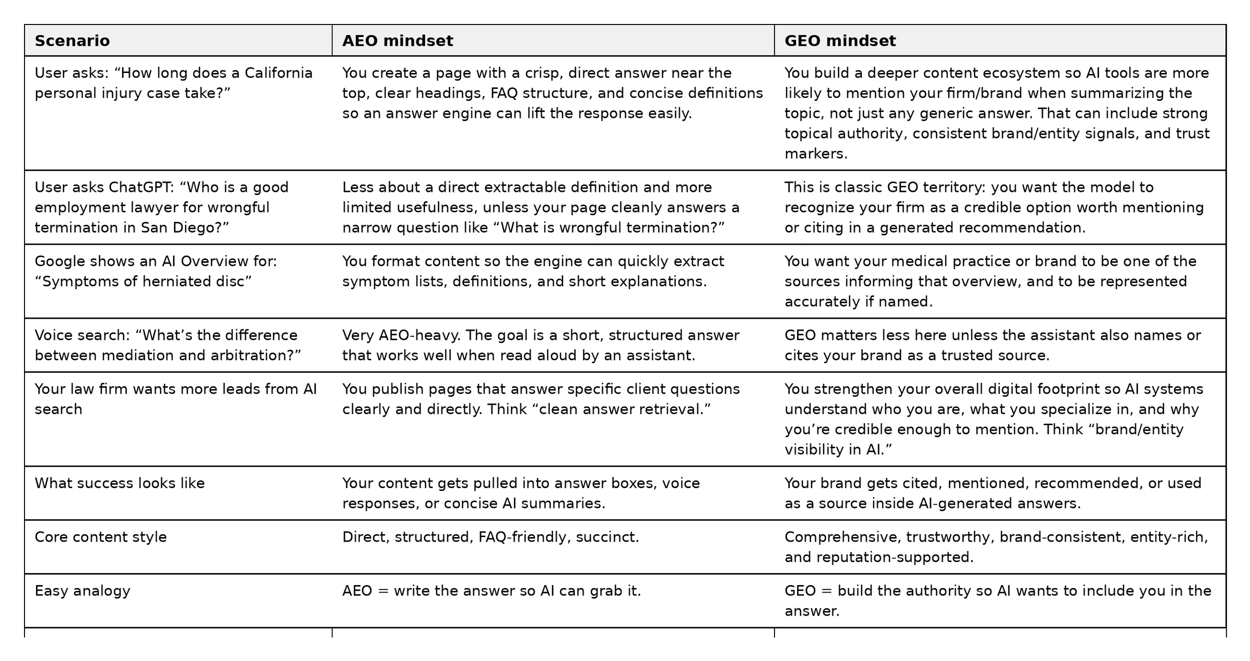 With GEO, you are building a broader content ecosystem that tells AI systems: this firm knows what it is talking about, covers this topic deeply, updates content when the law changes, and deserves to be surfaced when someone asks who to trust.